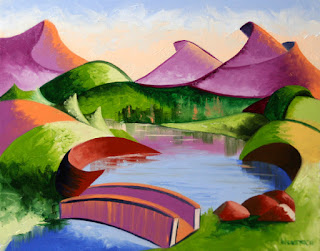 Mark Webster - Abstract Geometric Mountain Bridge Landscape Oil Painting.8x10" Oil on Panel.